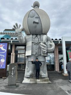 店の外に顔パネが...社内の年輩3人で..真ん中はもちろん